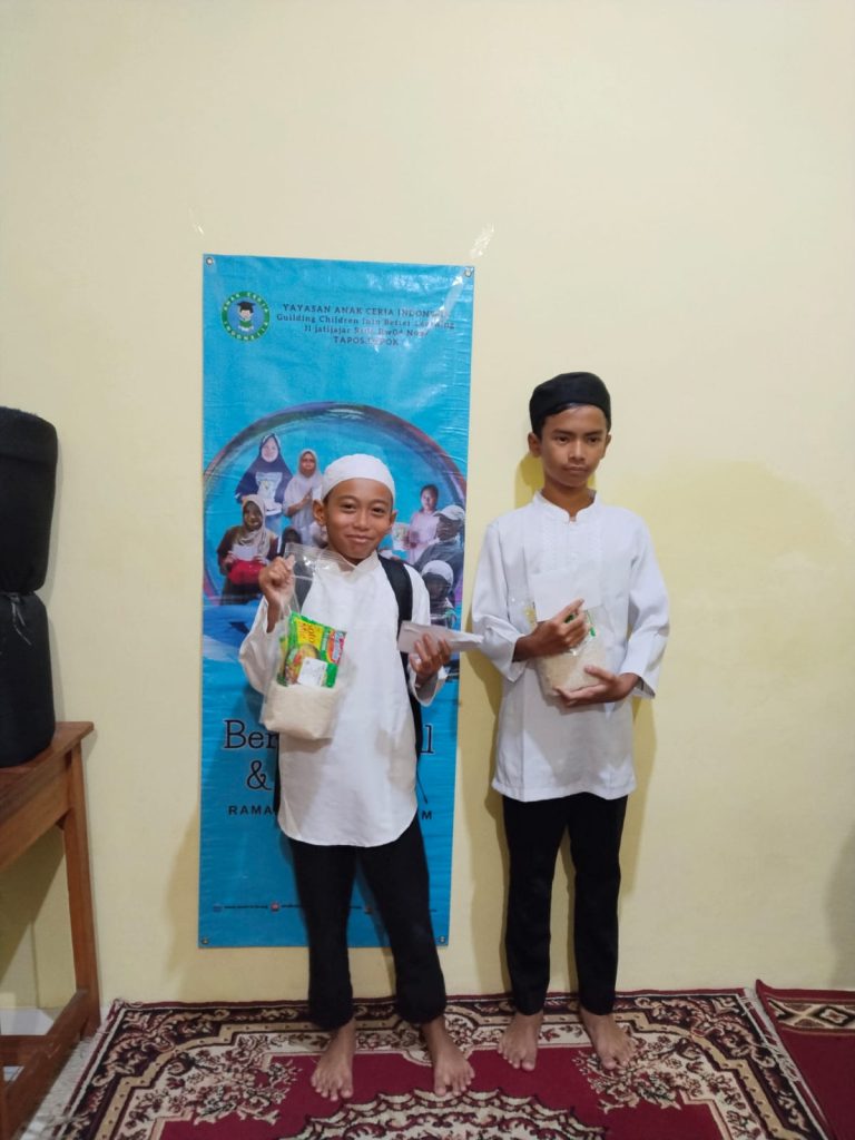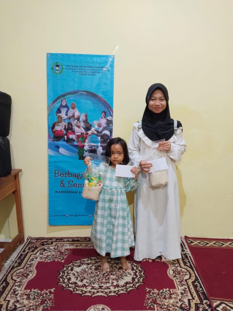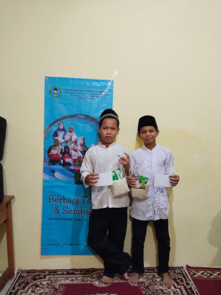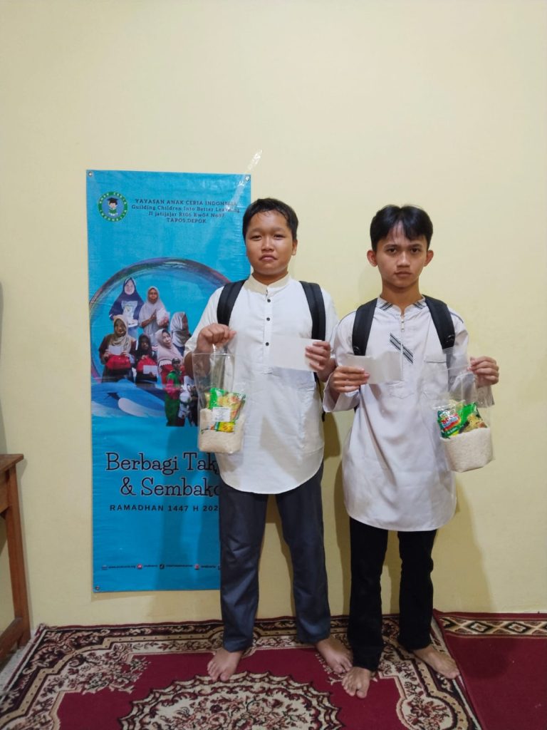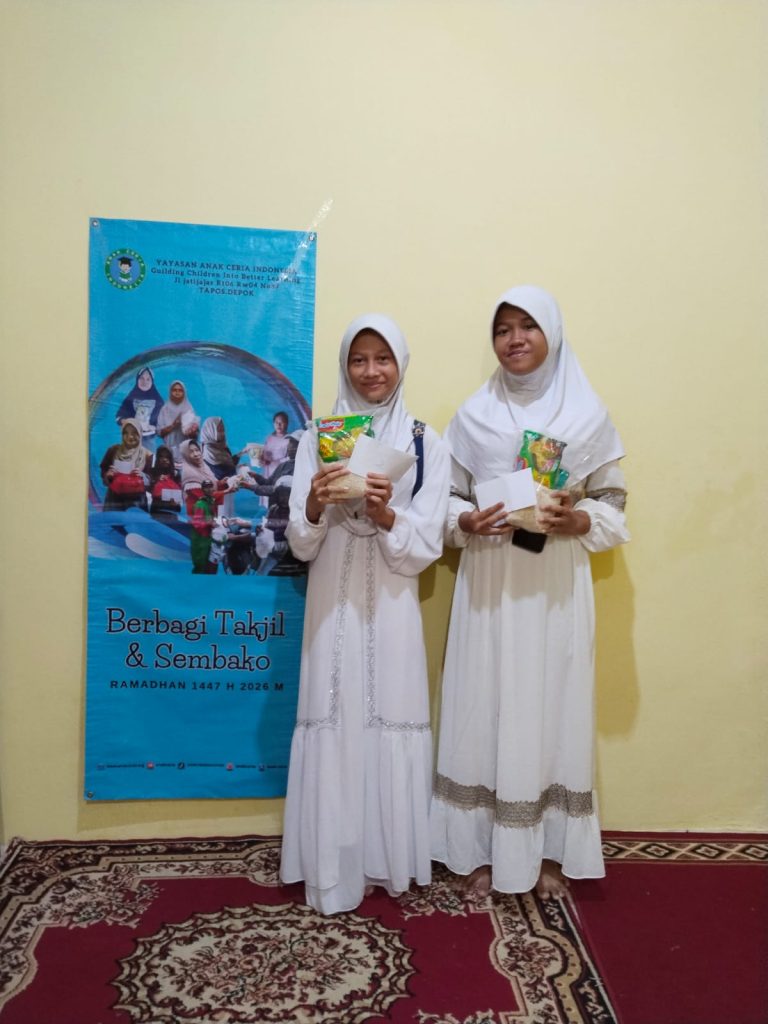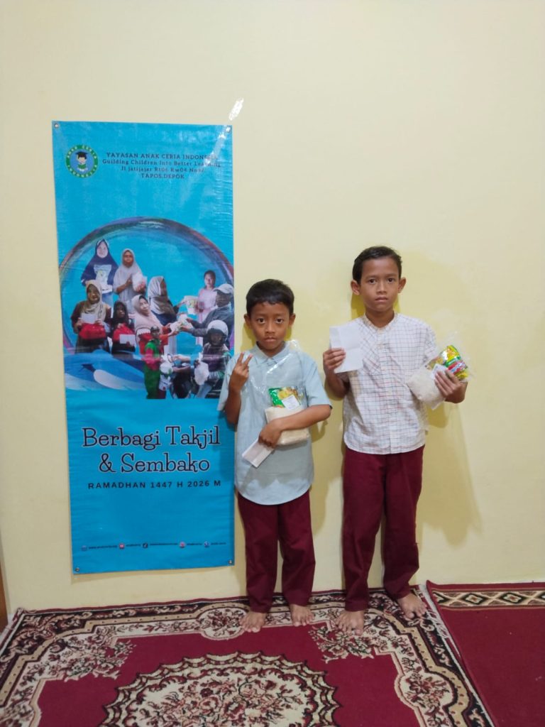 Alhamdulillāh, pada hari Senin, 02 Maret 2026, anak-anak binaan Yayasan Anak Ceria Indonesia kembali merasakan hangatnya kasih sayang dari para dermawan. Melalui kebaikan hati Bapak/Ibu serta seluruh donatur, telah tersalurkan donasi berupa paket sembako, nasi box untuk berbuka, serta uang santunan dalam amplop yang diberikan dengan penuh keikhlasan.