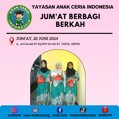 Alhamdulillah Pada hari Jum’at, 20 Juni 2025 anak-anak binaan Yayasan Anak Ceria Indonesia mendapatkan Sembako, Uang amplop & Nasi kotak dari Seluruh donatur. Kami mengucapkan terima kasih kepada seluruh donatur atas donasi yang diberikan kepada anak-anak yatim kami sebagai bentuk partisipasi dalam kegiatan Jum’at Berbagi Berkah ini. Semoga donasi yang diberikan dapat membawa kelimpahan rezeki, umur panjang yang barokah, kelancaran dalam segala urusan dan pekerjaan serta mendapat kesuksesan dunia akhirat. Aamiin…..