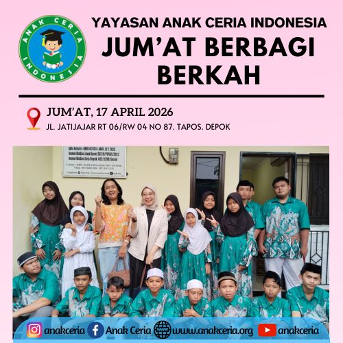 Alhamdulillahirabbil ‘alamin, pada hari Jum’at yang penuh berkah, tanggal 17 April 2026, anak-anak binaan Yayasan Anak Ceria Indonesia kembali merasakan kebahagiaan melalui kegiatan Jum’at Berbagi Berkah. Dalam kesempatan yang mulia ini, anak-anak yatim kami menerima bantuan berupa sembako, uang santunan dalam amplop, serta nasi kotak dari para donatur yang dermawan.