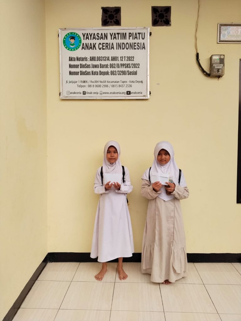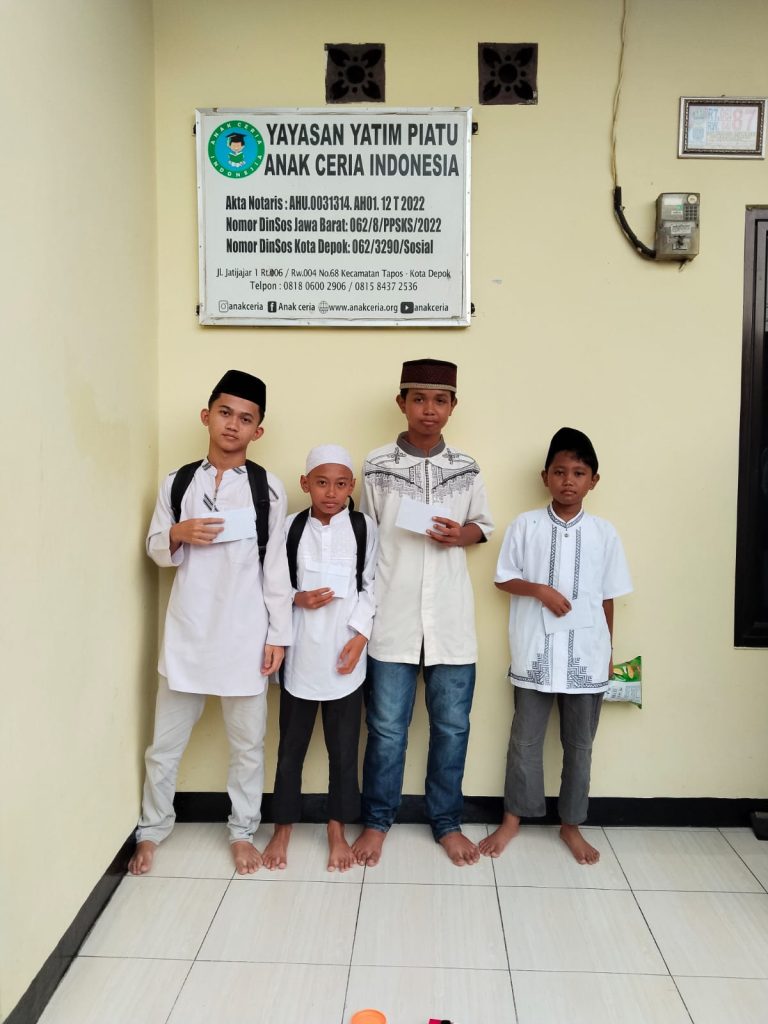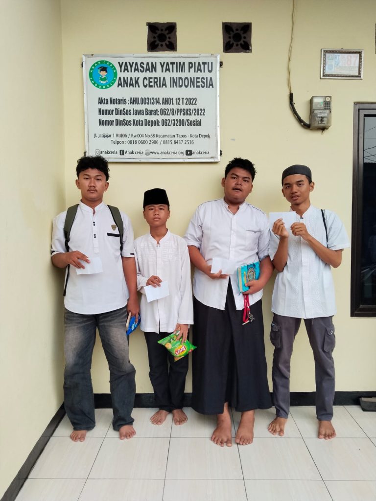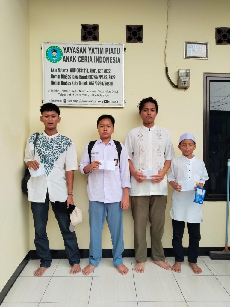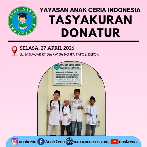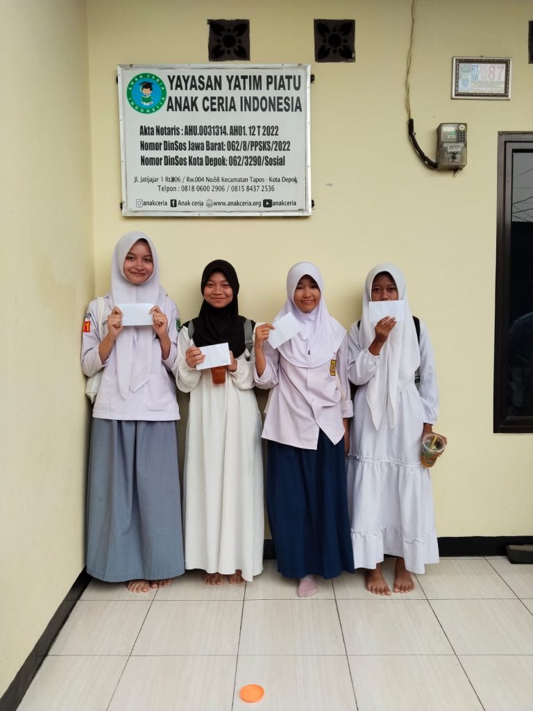Pada hari Selasa, 27 April 2026, anak-anak binaan Yayasan Anak Ceria Indonesia telah melaksanakan kegiatan Pengajian dan Tasyakuran mendoakan para donatur dengan penuh khidmat. Dalam kesempatan tersebut, anak-anak yatim kami menerima amanah berupa donasi uang amplop dari para donatur dermawan (Hamba Allah).